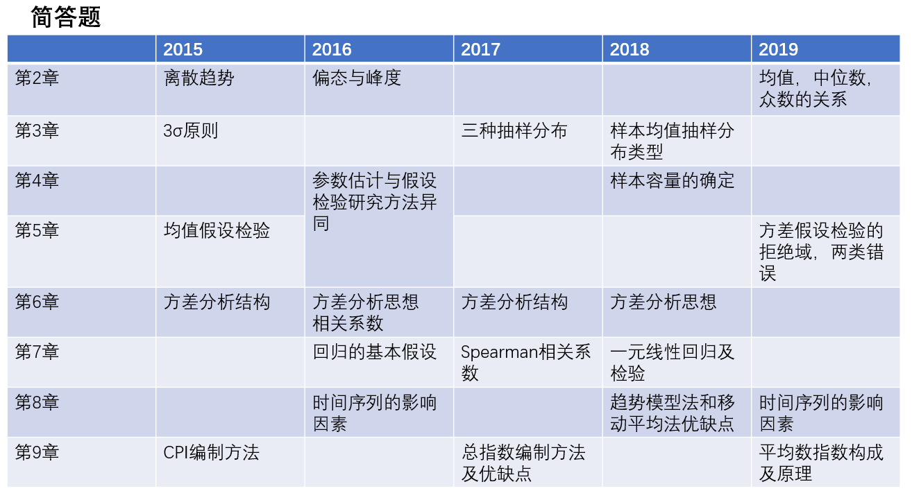 西交的432考题其实是比较常规的,不涉及很灵活的简答和很难的计算,基本都是我们必须要掌握的常规题型,但是由于计算量较大,单选题又考察的比较细致,所以很难高分。统计学的重点在2-9章,由于今年把回归部分列到了计量里,所以统计学的重点就变成了2-9(7除外)。单选题基本涉及到了每一章,所以复习的时候还是要比较细致(当然用计算机处理的那部分可以跳过)。简答题在考题中占比比较大,我个人感觉只要平时多注意总结,好好背就可以拿到一个不错的分数,所以大家一定要重视起来这部分内容,不能说我感觉自己考试的时候能写出来就行了,这样的同学考试的时候往往会吃亏的。我建议大家平时自己在笔记本上把每章的重点简答题按照考试的格式要求书写出来,考试前两个月就可以开始背起来了,早点开始背也可以给后期背政治和英语腾出来一些时间,有时间的同学可以尝试自己默写出来。计算题的题型比较固定,参数估计和假设检验一般只考一道大题,有时候只考一种,有时候结合起来考,这种题型都非常常规,只要掌握好每一种类型,计算不要出错,在考试的时候都是属于必拿分的题目;方差分析的三种类型都要掌握,今年就考察了有交互作用的双因素方差分析,所以不要存在侥幸心理,每一种类型的计算都要会;回归也是每年的必考题,今年应该是放在计量那部分考,一元多元都要会,还要会分析Eviews的结果输出表。指数那一章基本每年考的都是指数体系因素分析(平均数指数体系也要会),这部分计算也比较常规,注意书写的格式。最后希望大家复习的时候不要脱离课本,课本一定要多看几遍。下面是近几年简答题和计算题的考点分布,给大家一个参考~