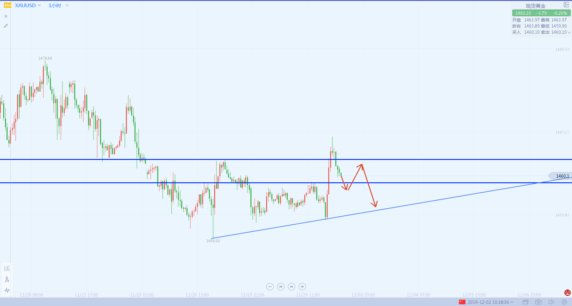 但是,周一开盘并没有延续这波上涨,反而是走下跌,重回1463下方,并不是强势上涨,反而是充满震荡的洗盘,周五暴涨之后周一集体看多反而不好涨,之前在周评也提到过,要上涨周一就会直接涨,更多的人会上不了车,现在回撤给上好位置,未必是做多的机会,反而继续走过山车的概率极大。