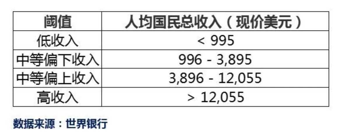 部分国家人均GNI(一般情况下GNI统计数值与GDP接近)与中等收入标准对比