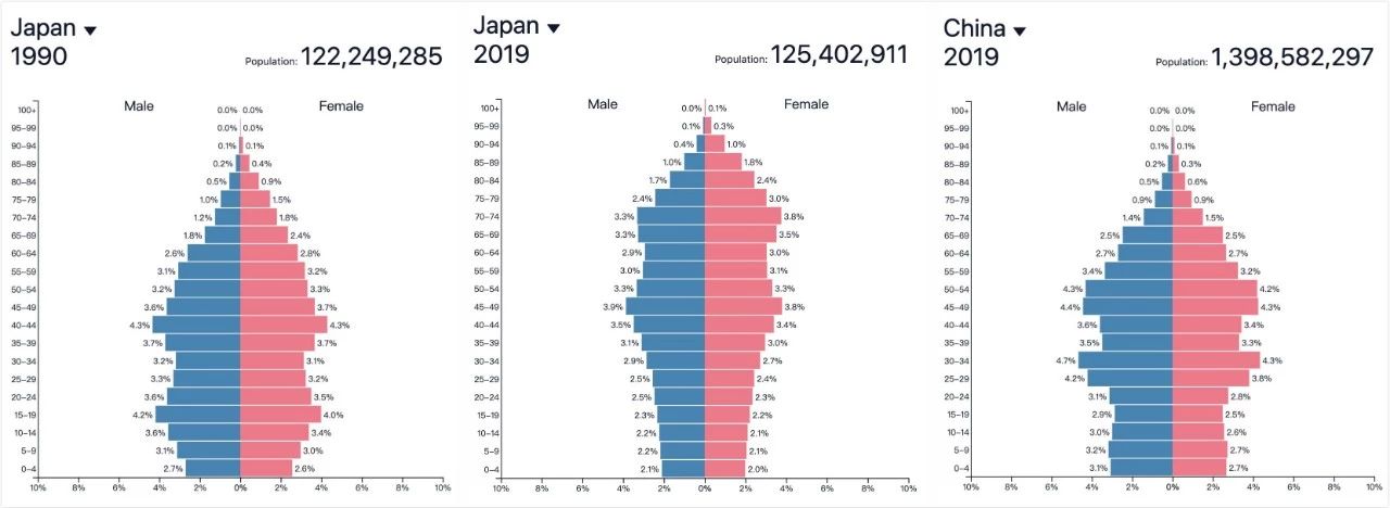 人口结构对比,左:日本1990,中:日本2019,右:中国2019 目前中国人口结构与1990年日本高度相似