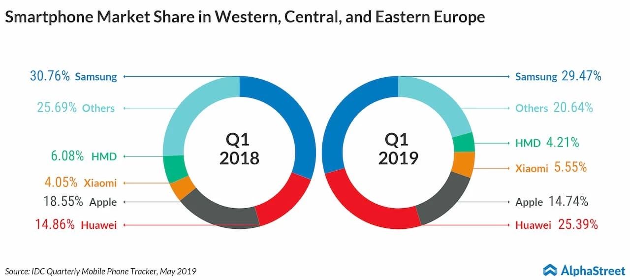 欧洲智能手机市场份额2018年一季度至2019年一季度