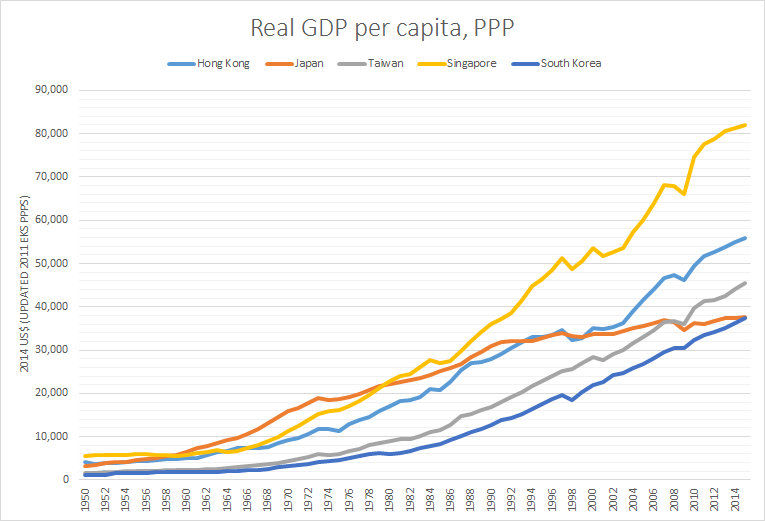 亚洲四小龙的崛起:香港、台湾、新加坡、韩国按照购买力平价计算的人均GDP已超日本