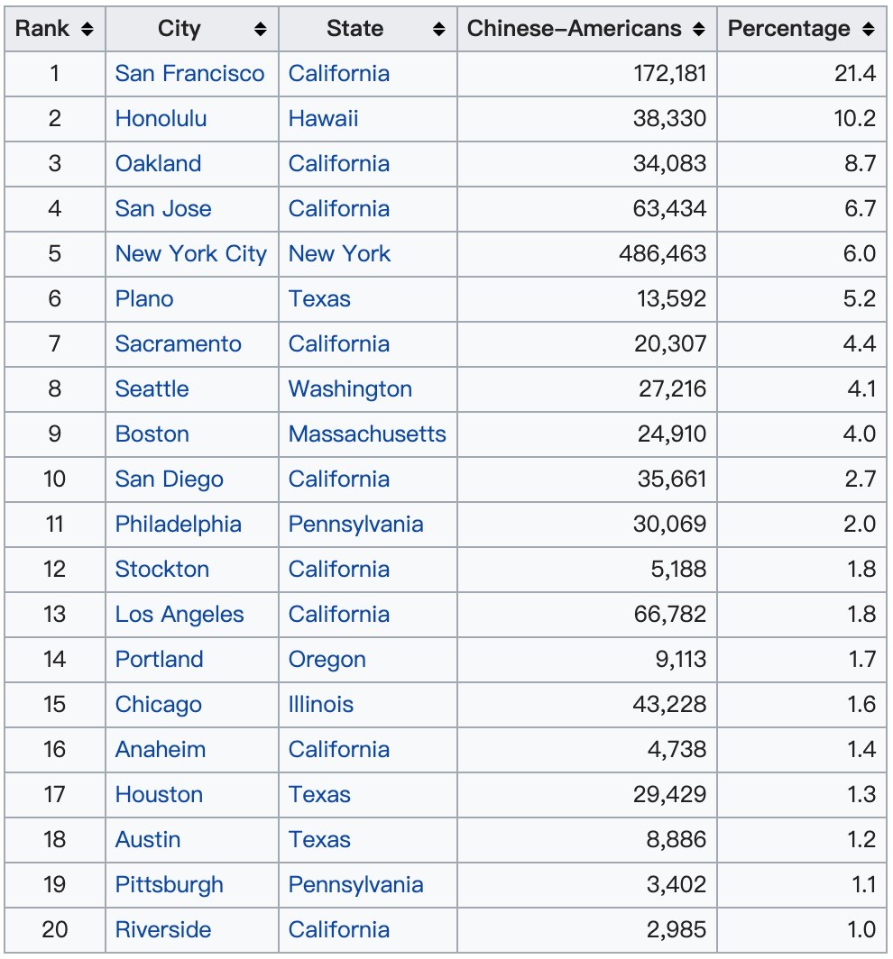 华裔美国人占比排名,旧金山排名第一,华裔占比21.4%