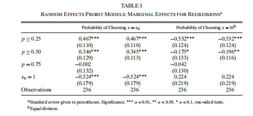 不知道为什么做出来的参数和文献不一致。文献是做了两组,一组操作是x0=0,另一组操作是x0=1。每组4个概率p=0, p=0.25, p=0.5, p=0.75。所以他自变量选了下图参数里的4个自变量,因变量是虚拟变量,参数表里左边是是否选x=x0 即0或1 ,右边是是否选x=10。所以我stata做的时候自变量、因变量算是0-1值的。用的是 probit y x0 p025 p05 p075
