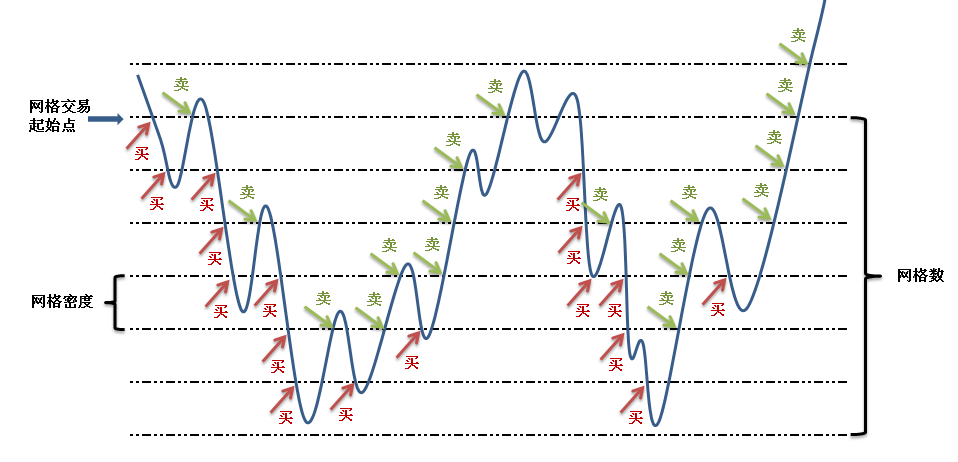 这里,我们以股票买入或者期货做多为例,把网格交易的过程图示如下: