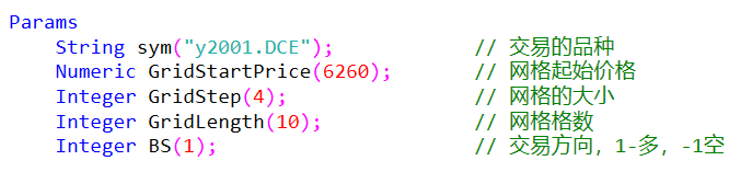 1、首先把上面提到的和网格交易法密切相关的几个要素定义为参数。包括:交易的标的、网格起始价、网格大小(即密度)、网格数、做单方向等。