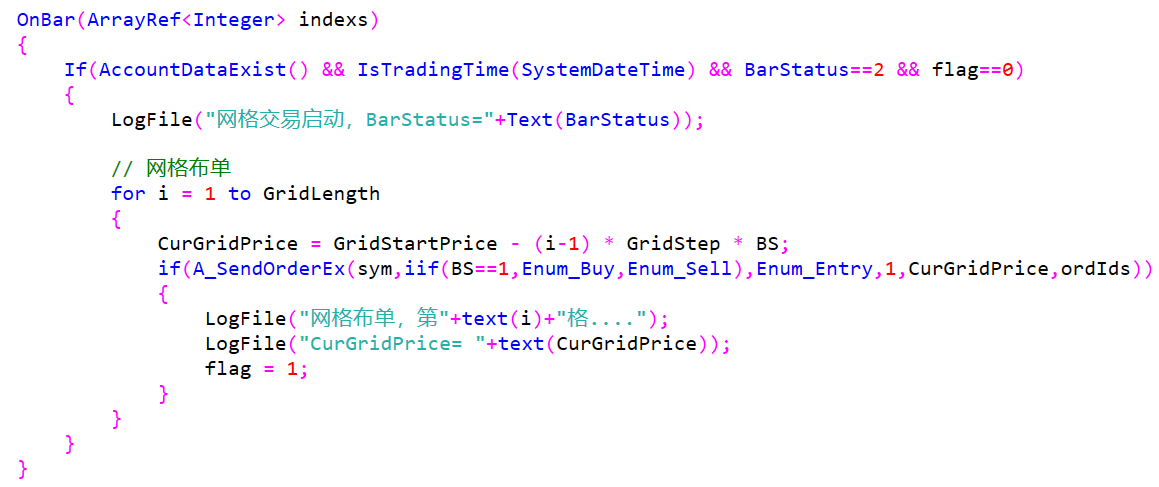 接下来除了一些变量定义和常规的初始化代码外,只要写好以下两段关键代码,就可以轻松实现一个可以实盘运行的基本网格交易策略了。