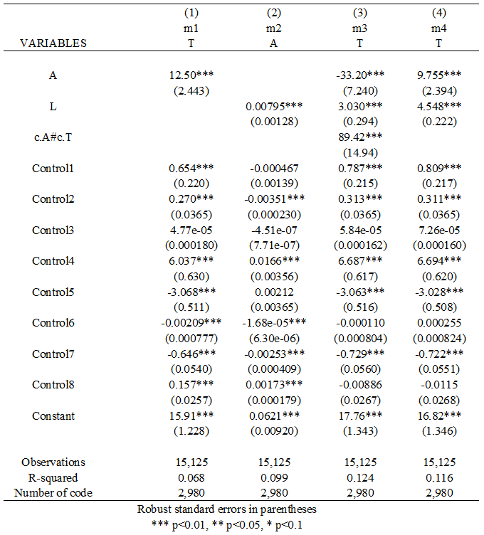 (4)L、A对T,T=α+β9A+β10L+β11Controlvar+e