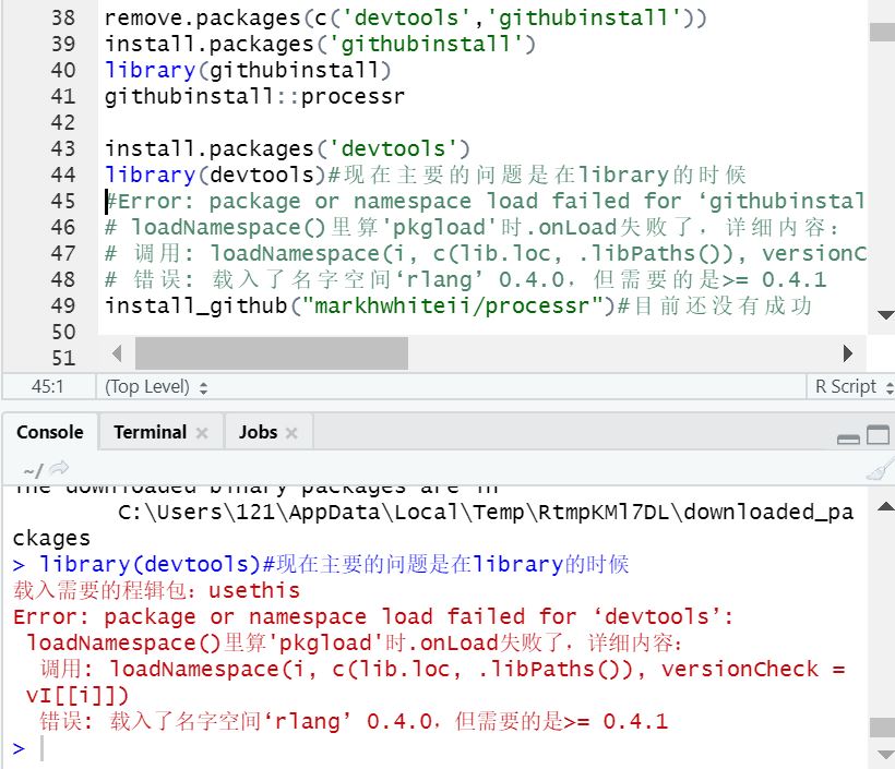 因为想用github上的processr包做调节分析,依次尝试了devtools和githubinstall,但都是下载成功后不能正常使用,install.packages显示正常,library时就显示错误: