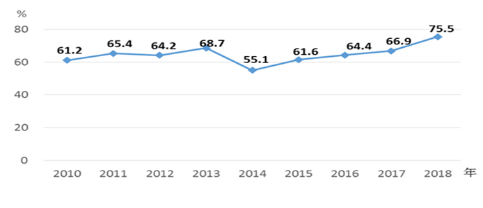 3.妇女生殖保健服务不断加强。国家实施免费计划生育技术服务基本项目,普及避孕节育、优生优育和生殖健康知识,提高生殖健康水平。全国已婚育龄妇女避孕率一直保持在80%以上。截至2018年底,农村妇女宫颈癌、乳腺癌检查已覆盖全国所有贫困县。妇女常见病筛查率经过几年低位徘徊后有了明显上升,由2010年的61.2%上升到2018年的75.5%,提高14.3个百分点,比2017年提高8.6个百分点,但距《纲要》规定的“达到80%以上” 的目标仍有差距(见图2)。