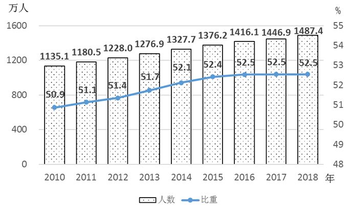 2.女性基本医疗保险覆盖面继续扩大。据不完全统计,2018年,全国女性参加基本医疗保险的人数超过5.4亿人,比上年增加1926万人,是2011年的2.9倍。其中女性参加城镇职工基本医疗保险的人数为1.5亿人,比上年增加643万人,比2011年增加3547万人;女性参加城乡居民基本医疗保险的人数超过3.9亿人[2],比上年增加1283万人,是2011年的5.2倍。