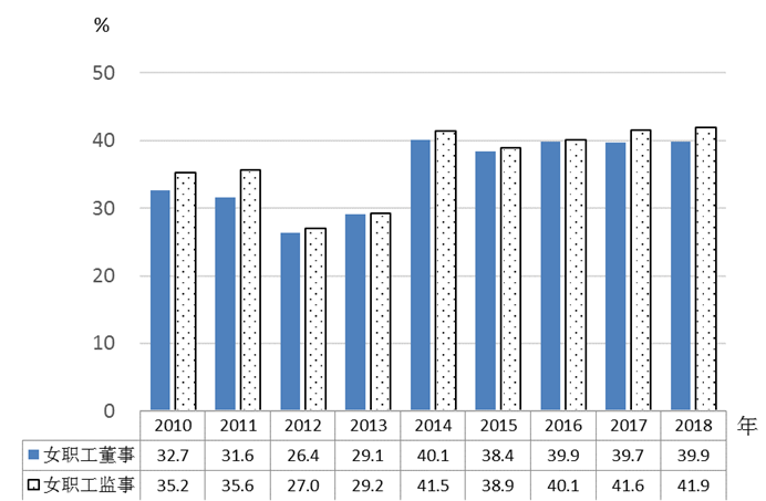 2.女性积极参与企业经营管理。2018年,企业董事会中女职工董事占职工董事的比重为39.9%,企业监事会中女职工监事占职工监事的比重为41.9%,分别比上年提高0.2和0.3个百分点,与2010年相比分别提高7.2和6.7个百分点(见图6)。