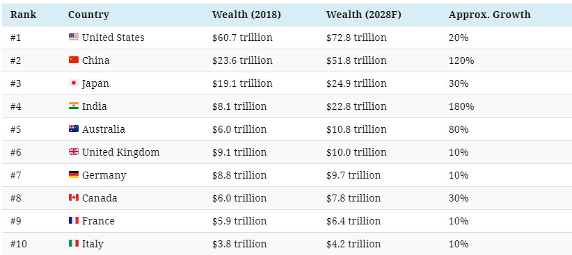 Private Wealth: Now and in the Future[size=1.1]Using data from the Global Wealth Migration Review, here are the 10 wealthiest nations both now and as forecasted in 2028.