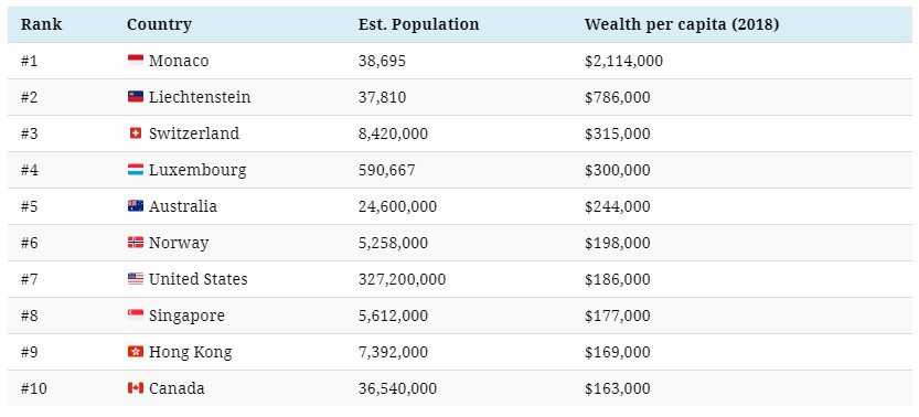 [size=1.1]Liechtenstein, a microstate that sits in the Alps between Switzerland and Austria, also has a high average wealth of $786,000 per person. Like Monaco, its population is well under 50,000 people.
