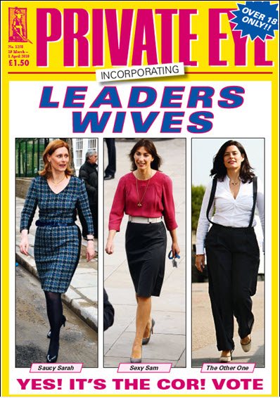 看到这期《Private Eye》的封面,令人不禁暗笑。英国市面上有一本成人杂志叫做《Readers Wives》,《Leaders Wives》显然是以此为引伸做为反讽,。三位英国朝野政党领袖的夫人则被介绍为「妖娇莎拉」、「性感莎曼珊」…,「众人叫好喊赞之余,投上一票啦!」。