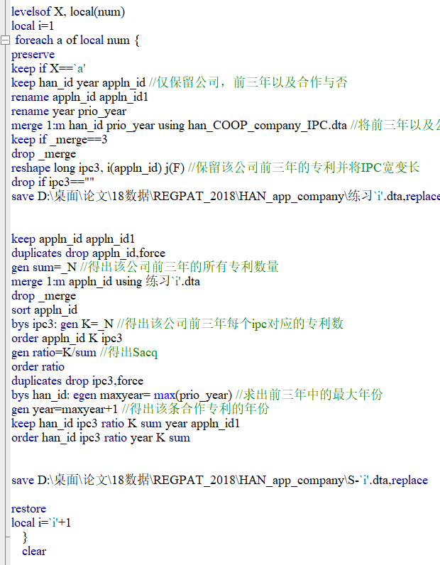 如题,出现observations如何返回开始,重新进入循环。进行第一个公司的时候,保留某条合作专利前三年该公司申请的专利,但是刚好没有观测值,如何在save之后返回,进入下一条专利的计算。如果有观测值则继续进行后面keep的计算。