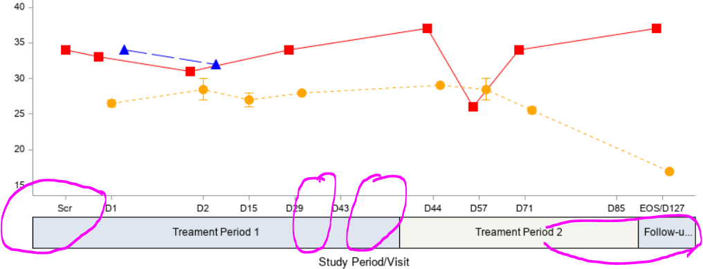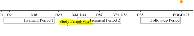 我现在画出来的图(下图),这个对应关系不太对,我用粉色圈出来了,比如 D1 之前的,Scr那块不应该是period1, D29到D43那块应该是空的才对,D43应该算period 2, D71后面应该是follow-up period....