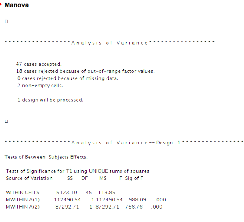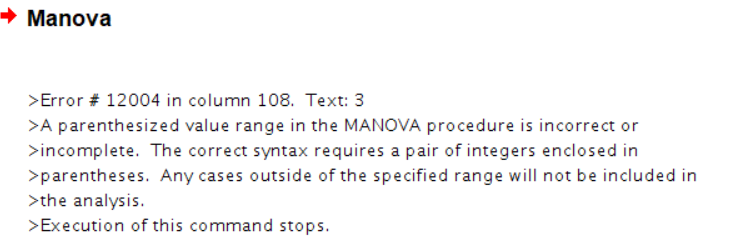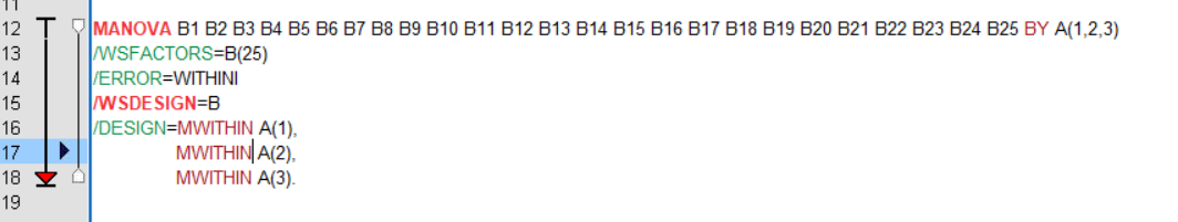 3*25的混合设计。三种干预方式,25个测量指标。发现有交互作用后,进行简单效应分析。语句如下:希望大神们帮我看看语句哪里错了~ 我将自变量A写成(1,2)就能运行,只要加上了“3”就不能运行。也就是说,我正常将组间变量写成两个水平时,这个语句是正常运行的。每当把第三个水平加进去,就怎么都运行不了。