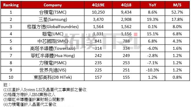 2019年第四季全球前十大晶圆代工厂营收排名(单位:百万美元)。 (资料来源:各厂商、拓墣产业研究院整理)