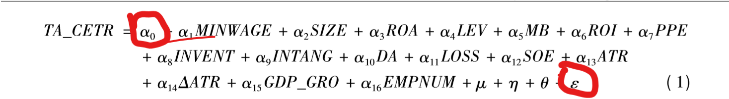 小白想请问,看到很多论文里的实证模型里都会有没有解释的变量,不知道什么意思。第一个和最后一个变量,有没有人可以帮忙解释一下呀?文章是经济研究19年第10期的“最低工资标准的上涨是否会加剧企业避税?”