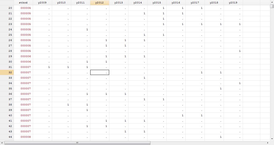如图所示,请问如何才能将相同代码不同年份的1取并集,合并为只有唯一代码的表呢?