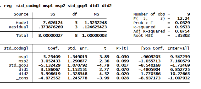 我尝试用一个回归模型去做,std_codmgl为环境因素,msp1为13-16年实施政策的虚拟变量,msp2为16-18年实施政策的虚拟变量,std_gop3为经济发展数据,did1=msp1*std_gop3, did2=msp2*std_gop3, 得出如下回归结果,请问可以这样使用DID模型嘛?如果可以,这个回归结果要怎么解读呢?