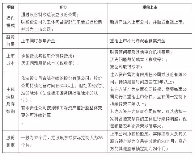 根据现行《上市公司重大资产重组管理办法》,重组上市在发行条件和审核要求上等同于IPO。IPO较重组上市优势在于股权稀释比例较低、上市操作过程明确。重组上市较IPO优势在于审核周期相对较短。另外,重组上市对重组方要求门槛更高,重组方只有具备相当的盈利能力,才能取得上市公司控制权。