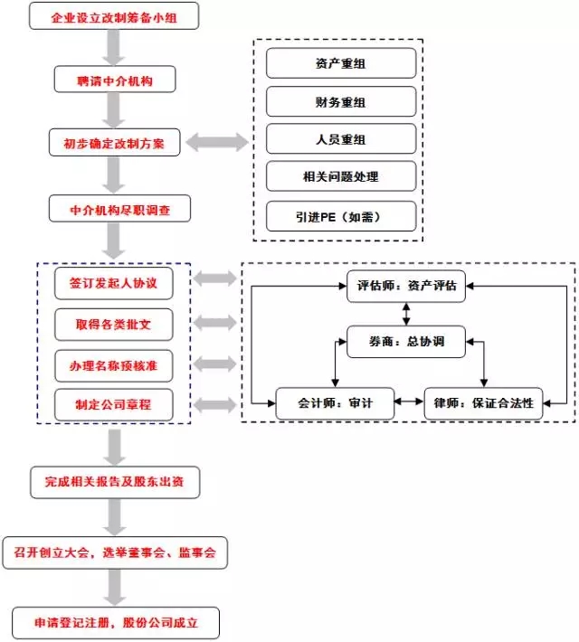 企业改制设立股份公司需设立筹备小组,通常由董事长或董事会秘书牵头,汇集公司生产、技术、财务等方面的部门负责人,全权负责研究拟订改组方案、聘请改制有关中介机构、召集中介机构协调会、提供中介机构所要求的各种文件和资料。