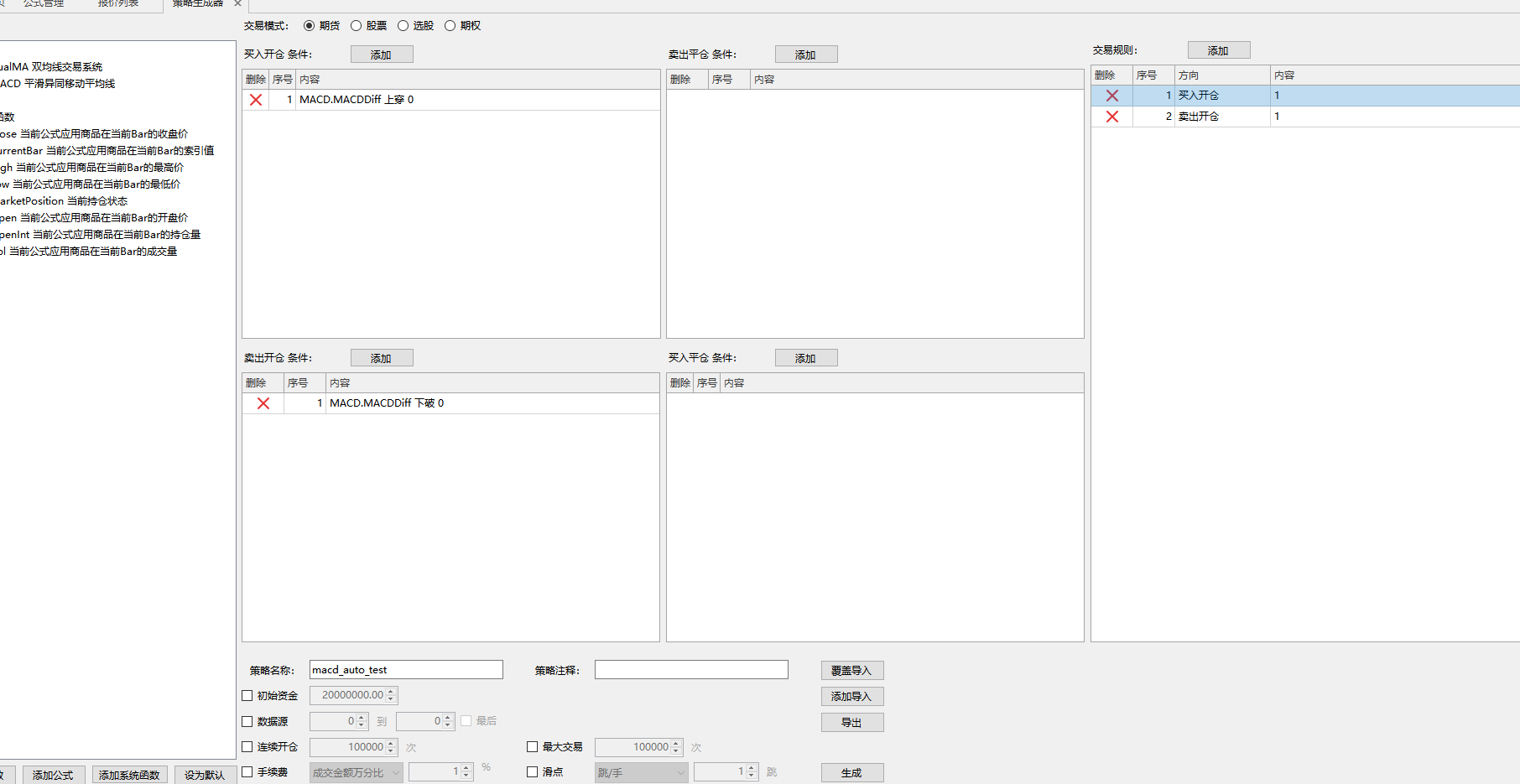 界面内容挺多,一眼看上去,正是我要的东西。自己组合条件,TBQuant这里按四种开仓分了类别,对应种类的开仓就放到对应模块下,最后组合成交易规则。这种设置方式十分明晰,也大大方便了策略生成器的使用。