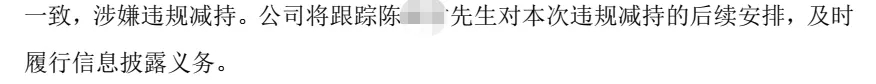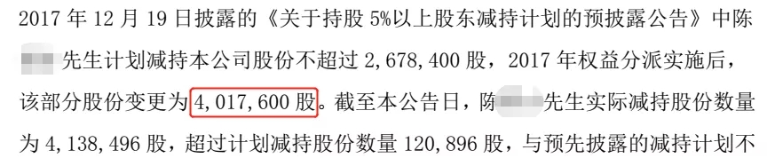 根据监管函所述,陈某本次违规原因之一在于原计划减持4,017,600股股票(40%),实际减持4,138,496股,减持数量超出了原先预披露的减持计划(同减持承诺)。