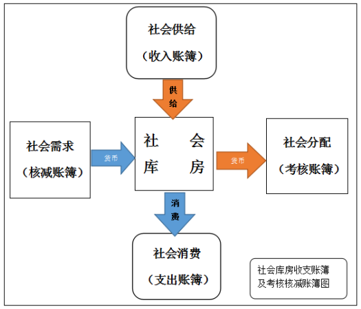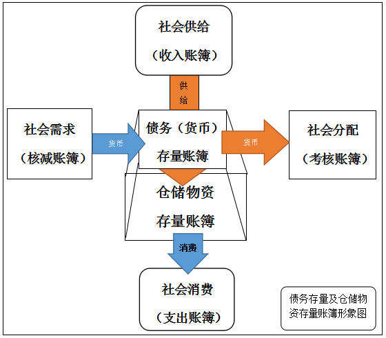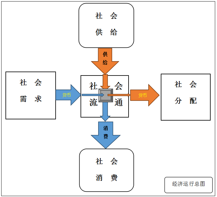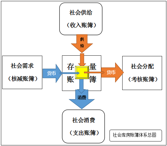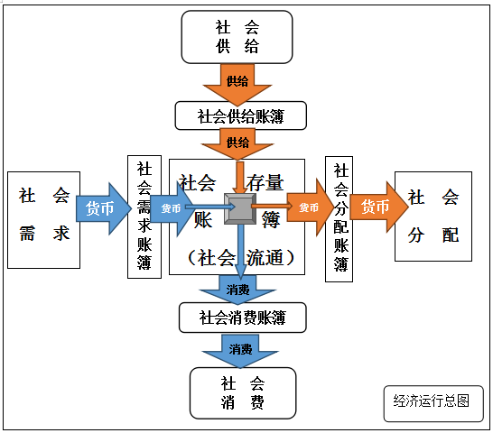 “社会库房”的“收支账簿”和“存量账簿”及其具体的运行过程,共同构成了“社会流通”。而“社会流通”配以“社会需求”、“社会供给”、“社会分配”、“社会消费”共同构成了“经济运行总图”。