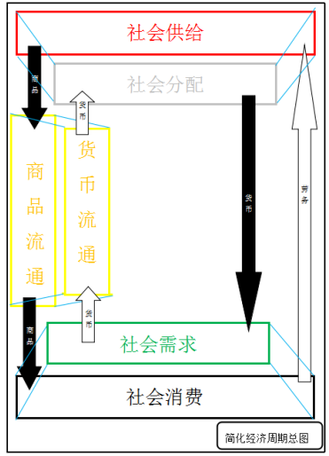 而“社会需求”、“社会供给”、“社会流通”、“社会分配”、“社会消费”五个经济过程之间具体的联系。以及它们同“币流”、“货流”之间的关系,书中也通过推导而得出了一个“简化经济周期总图”。