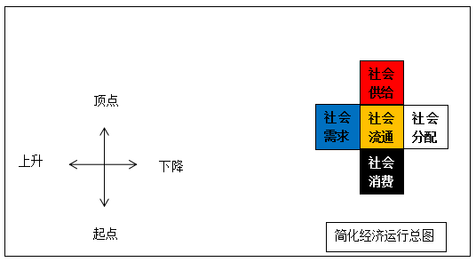 “五方图”和“简化经济运行总图”都遵循了万事万物诞生、成长、衰老、消亡的过程,或有上升、顶点、下降、停止的运动。两者经过推理后罗列为下图: