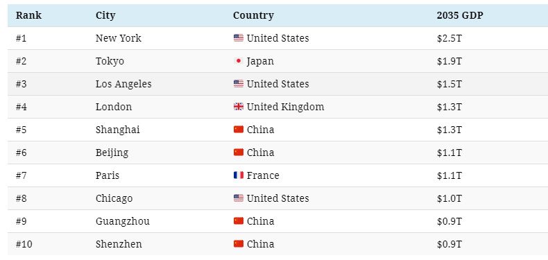 Top 10 Cities by Projected GDP[size=1.1]The top 10 cities by gross domestic product (GDP) in 2035 will be fairly widespread. Three cities are expected to be in the U.S.—New York, Los Angeles, and Chicago. The Big Apple’s forecasted $2.5 trillion GDP likely stems from its strong banking and finance sectors.
