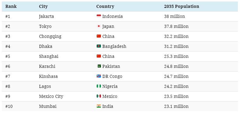 [size=1.1]While Jakarta’s 38 million-strong population is expected to emerge in first place, the city may not retain its status as Indonesia’s capital for much longer. Rising sea levels and poor water infrastructure management mean that Jakarta is rapidly sinking—and the government now plans to pivot the capital to Borneo island.
