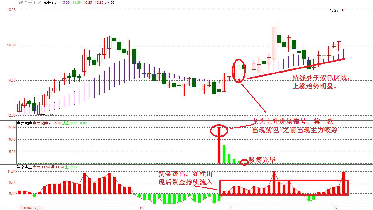 1、龙头主升+主力吸筹指标:先吸筹,后主升(紫色代表中线上涨,第一个紫色信号通常是进场信号;配合主力吸筹模型,一个月内有主力吸筹信号!)