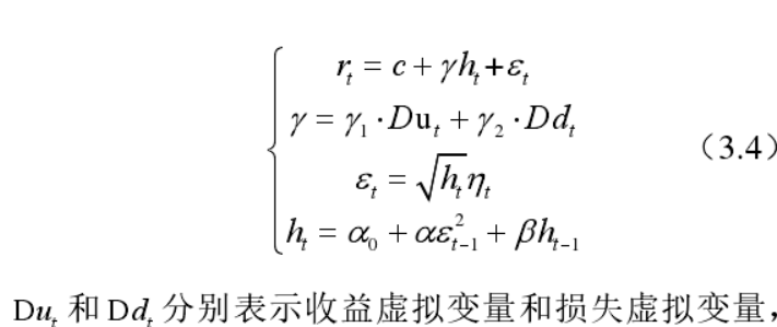 如下面的图片中所示,第一个方程为均值方程,(r为收益率,h为条件方差),最后一个方程为方差方程,收益和损失两个虚拟变量已经在Eviews中定义出,现在想要估计γ1和γ2的值,求教该如何在Eviews中输入呢?求步骤谢谢!