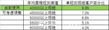 分析上面的贷后情况,我们发现处理不同情况的贷后数据,不会出现特别大的数据的调整情况,于是我们考虑将车里程的风险进一步放宽。