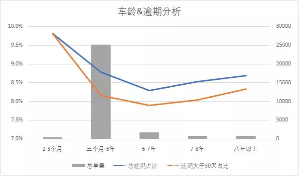 最后因为有相关的贷后表现,我们就处理了不同车龄的车的贷款的表现情况,进一步我们就将逾期的情况整理成以下的结果: