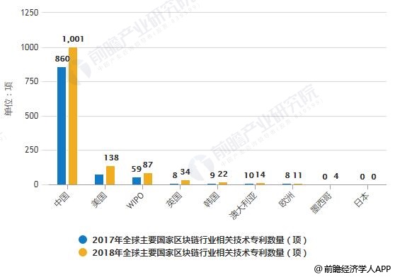 2017-2018年全球主要国家区块链行业相关技术专利数量统计情况