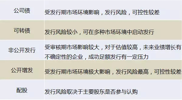 通过以上的分析,我们发现这五项融资工具各有长处,上市公司融资时具体选择哪一种,需要综合考虑自身的融资规模需求、对未来业绩增长的判断以及资本市场情况的适用性。话不多说,小编速速送上各类工具的比较总结版: