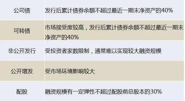 上市公司普遍使用的融资工具包括:公司债、可转债、非公开发行、公开增发和配股,这五种融资方式既有互通之处,又存在着较多差异,接下来小编将从融资规模、融资效率、募投限制、对业绩摊薄的影响、融资成本、审核周期、发行时机、发行风险和适用公司类型这九个维度来进行比较。