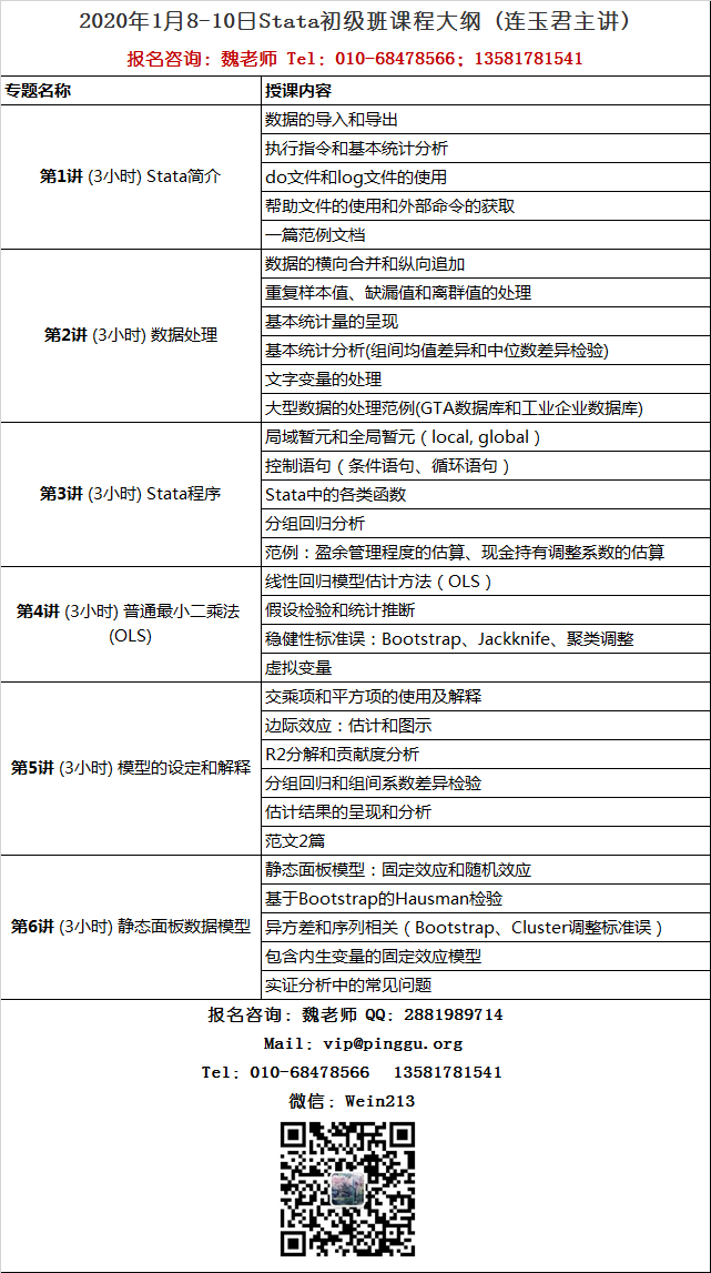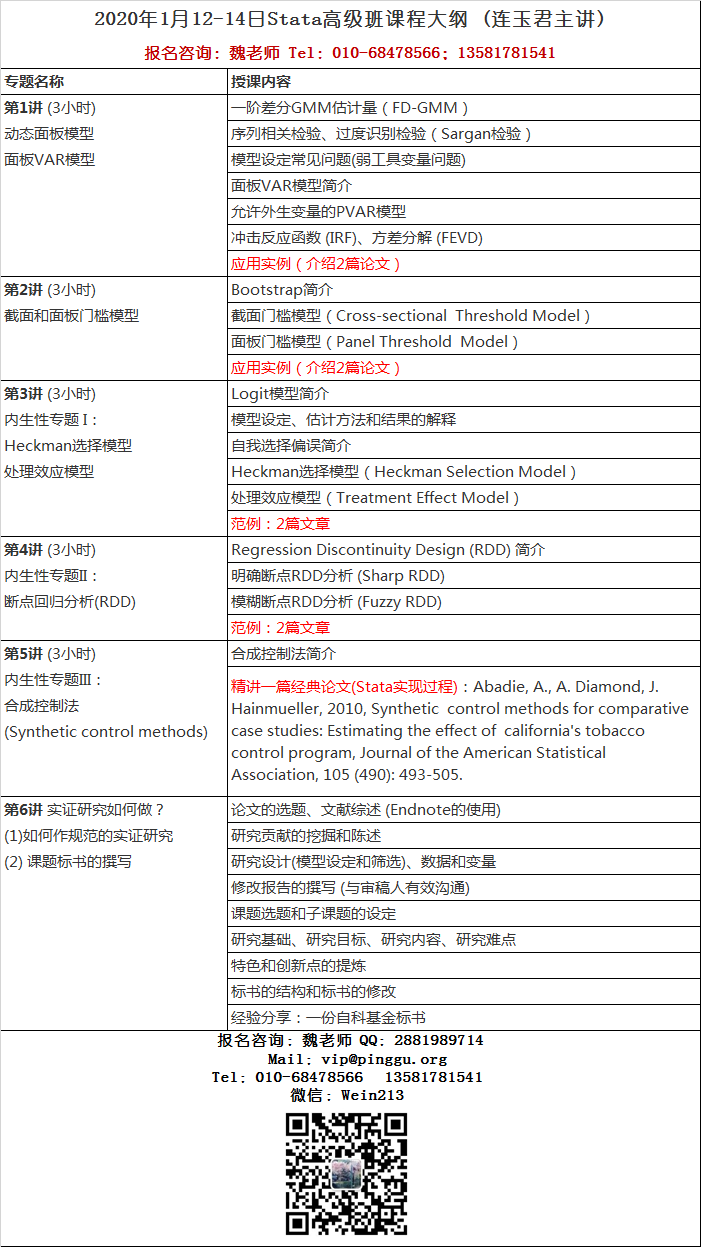 Stata高级班包括6个专题,重点讲述各类面板模型以及一些新近发展的内生性处理方法。主要涉及如下几个方面的内容: