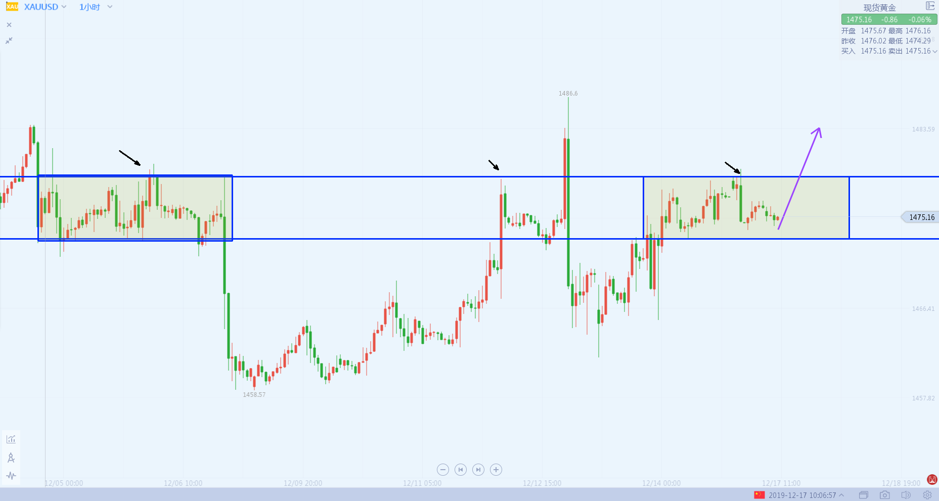 昨日,日K收了个小十字星,全天5-6美金的波动,去掉两边毛刺,手一抖就是好进不好出,日内延续震荡上涨节奏,晚间止步1480,但是只能看做滞涨,而并不是转向,1480遇阻以后大阴下杀并未改变1小时级别结构1473的拐点没有破位依然还有向上的希望,若再盘横两天不涨,向上的动能就会被逐渐蚕食,所以今天站上1479就是一波向上冲击,注意至少是小时K收线在1479上方。