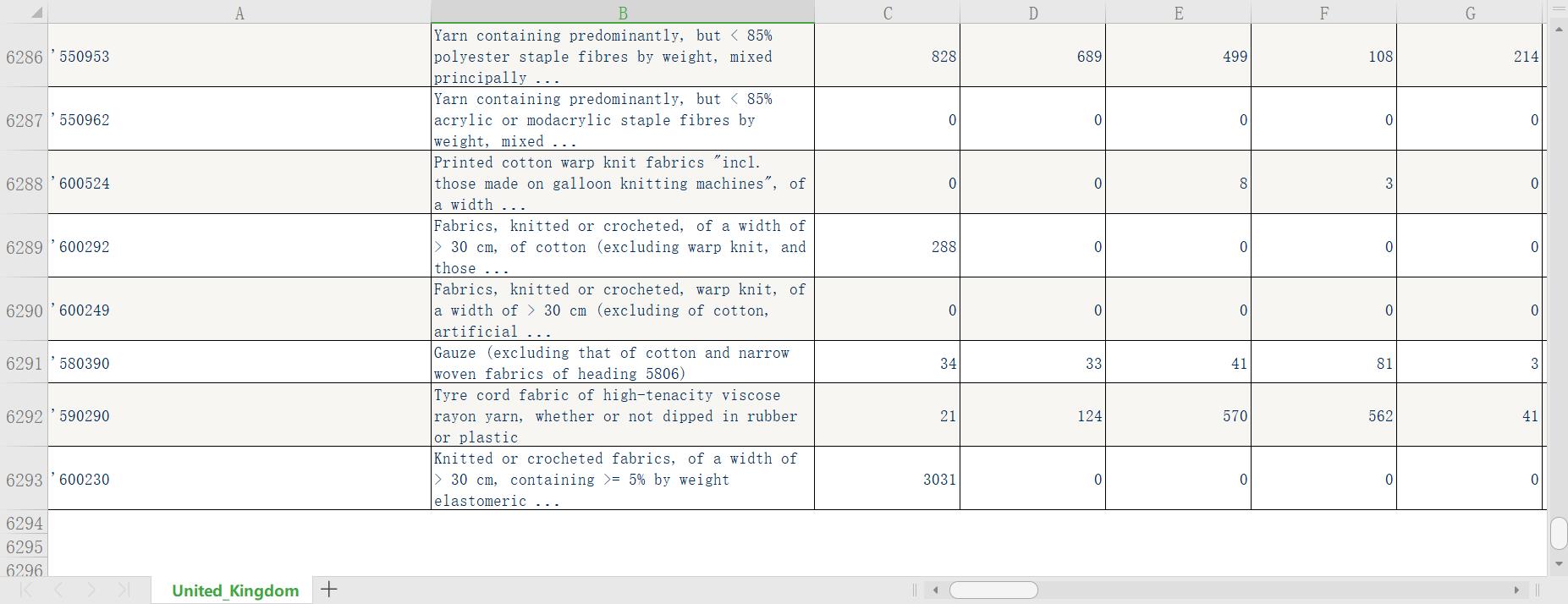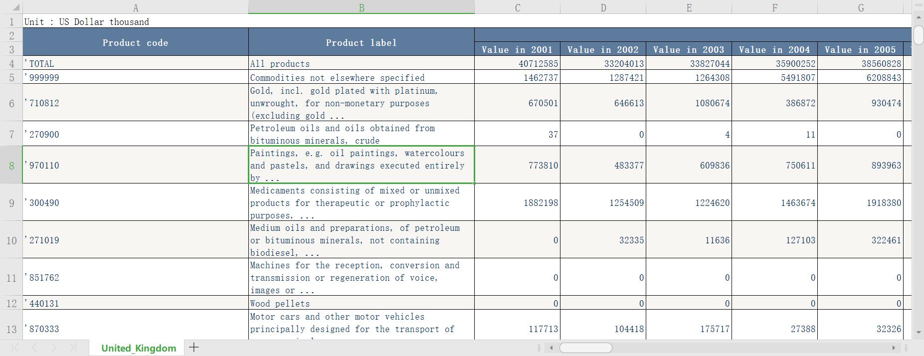 下面是美国对世界各国HS6分位出口数据,HS6分类,从2001年到2018年,有219个国家和地区,覆盖所有主流国家,每一个国家一个excel表,可以查找美国对这个国家在2001-2018年之间HS6分位目录的出口额,金额单位为千美元,数据划分比较详细,来源正规,以贸易类别最丰富的对日本和英国出口为例,HS6分位都达到6000多种,数据极为详细,有兴趣的可以下载过来详细了解一下。