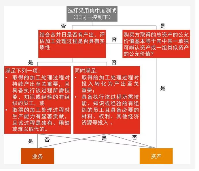 在根据业务的判断条件进行评估前,解释13号引入了集中度测试的简化处理方式。如果满足该测试,则企业无需进行进一步评估,可以直接判断被收购标的不构成业务。值得注意的是,没有通过集中度测试的交易并不会自动被判断为业务合并,企业需要根据解释13号进行进一步的具体评估。此外需要特别注意的是,集中度测试只限于非同一控制下的情况。