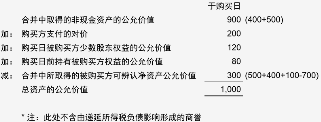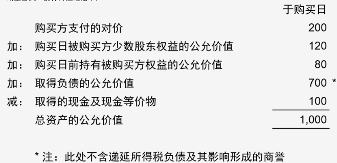 (2)总资产的公允价值=购买方支付的对价+购买日被购买方少数股东权益的公允价值+购买日前持有被购买方权益的公允价值+取得负债的公允价值(不包括递延所得税负债)-取得的现金及现金等价物-递延所得税资产-由递延所得税负债影响形成的商誉。