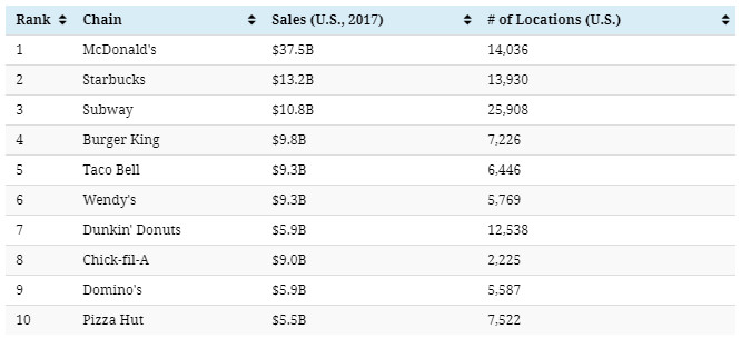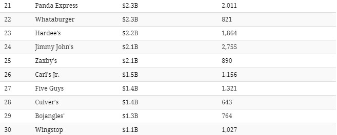 [size=1.1]Below are the top 30 fast food chains in the United States by revenue:
