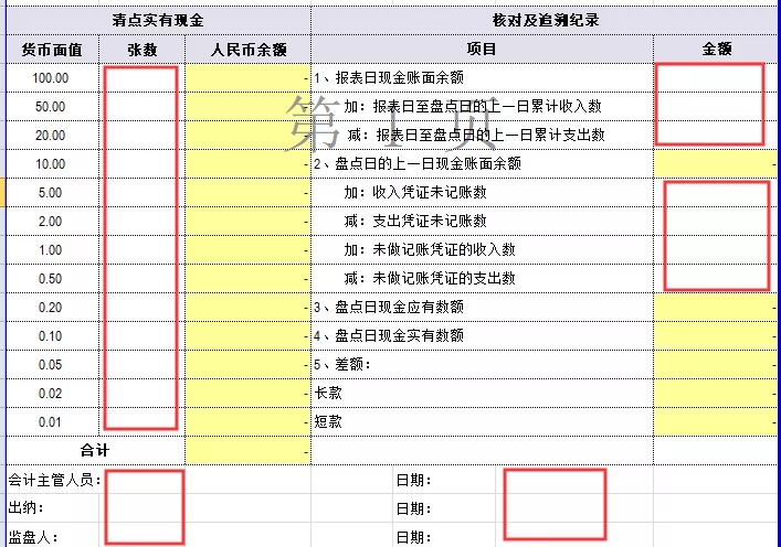 最后,简单说一下现金监盘表一般怎么填,先上表: