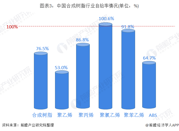 尽管近几年来,我国合成树脂自给能力不断上升,但仍有部分品种的合成树脂仍需大量进口。2017年,我国合成树脂整体自给率达76.5%。其中聚氯乙烯可完全自给;聚苯乙烯大致可实现自给,其自给率达91.8%;而聚乙烯、ABS树脂自给率则仅仅53%、64.7%。